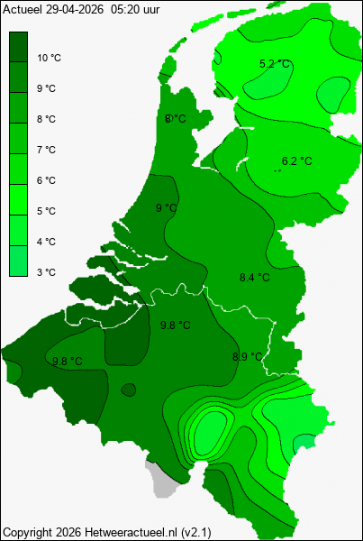 Het kaartje met de actuele temperatuur wordt iedere 10 minuten opgebouwd uit de actuele gegevens van alle weerstations, mits de data minder dan 1 uur oud is.
