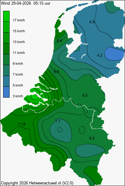 Het kaartje met de actuele wind windsneldheid (10 minuten gemiddelde) wordt 2 keer per uur opgebouwd uit de actuele gegevens van alle weerstations, mits de data minder dan 1 uur oud is.