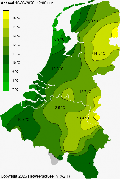 Het kaartje met de actuele temperatuur wordt iedere 10 minuten opgebouwd uit de actuele gegevens van alle weerstations, mits de data minder dan 1 uur oud is.