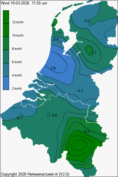 Het kaartje met de actuele wind windsneldheid (10 minuten gemiddelde) wordt 2 keer per uur opgebouwd uit de actuele gegevens van alle weerstations, mits de data minder dan 1 uur oud is.